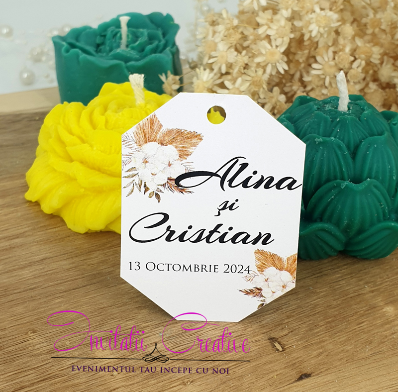 Etichetele pot fi personalizate cu numele mirilor si data evenimentului sau numele bebelusului si data evenimentului/data nasterii, in functie de momentul celebrat.