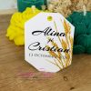 Etichetele pot fi personalizate cu numele mirilor si data evenimentului sau numele bebelusului si data evenimentului/data nasterii, in functie de momentul celebrat.