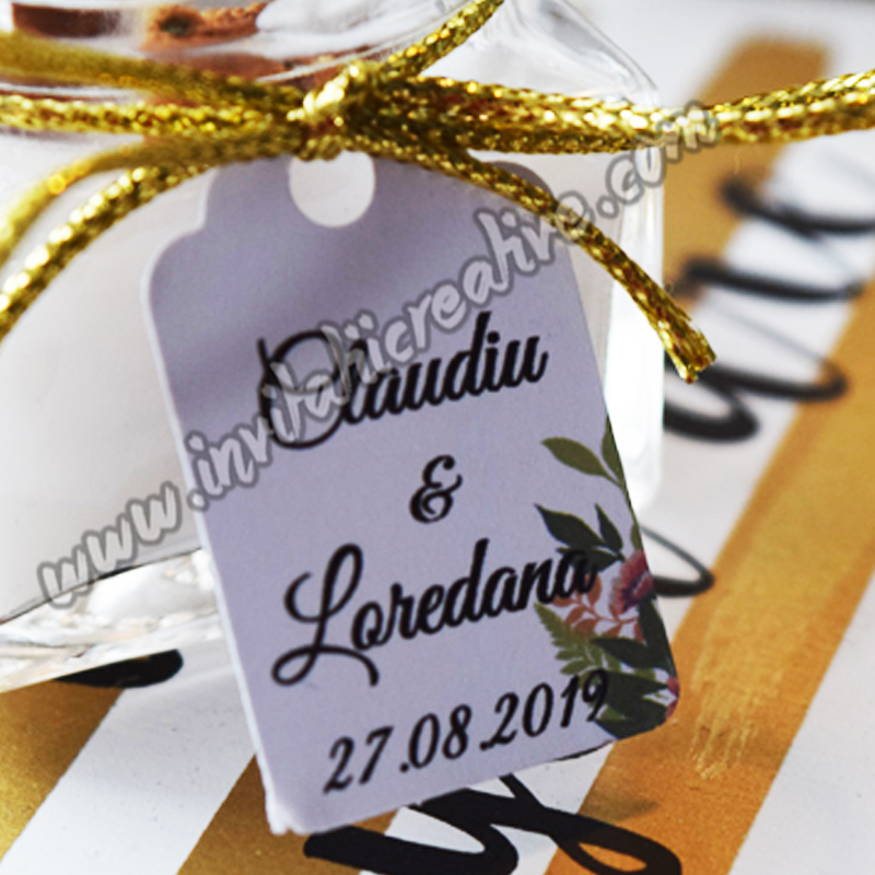 Etichetele pot fi personalizate cu numele mirilor si data evenimentului sau numele bebelusului si data evenimentului/data nasterii, in functie de momentul celebrat.