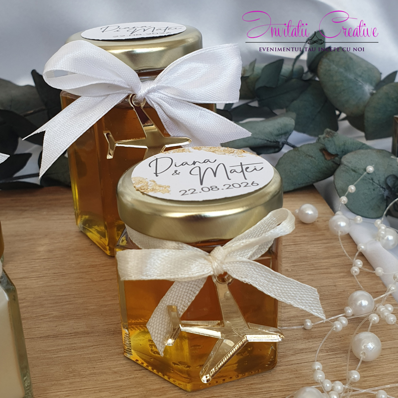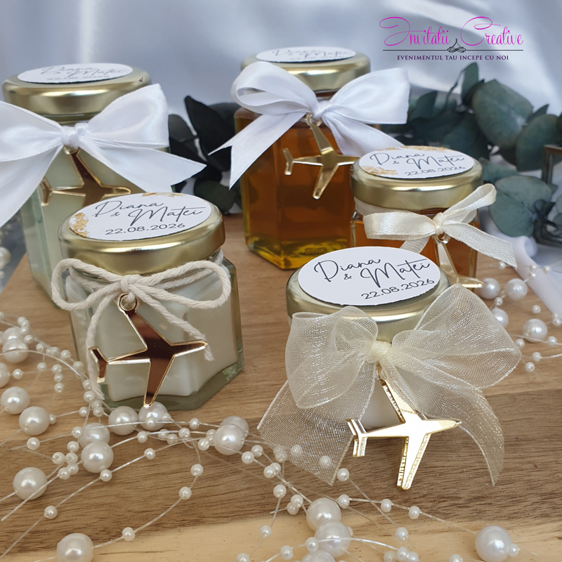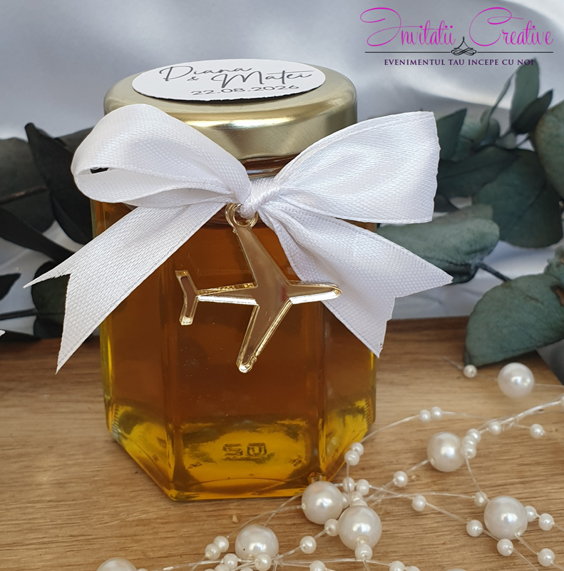 🍯 Mierea polifloră – un dar autentic al naturii, plin de savoare și binecuvântare, exact ca fiecare moment petrecut alături de cei dragi. 🎀 Ornament elegant – fiecare borcănel este îmbrăcat în fundițe delicate, pentru un plus de rafinament și căldură. ✈️ Detaliu special – un avion din pexiglas auriu, perfect pentru iubitorii de călătorii și aventuri, un reminder că fiecare drum duce spre amintiri prețioase.