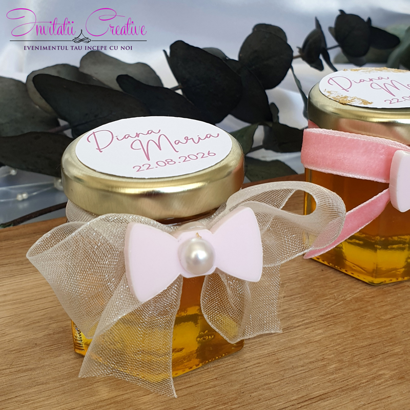 🎀 Ce face acest borcănel special? ✔ Conține miere polifloră, un dar autentic al naturii, plin de savoare și binecuvântare. ✔ Este ornat cu fundițe delicate, care adaugă un aer sofisticat și festiv. ✔ Accesorizat cu o fundiță roz din pexiglas și o perlă, detalii care transformă această mărturie într-un veritabil simbol al eleganței și rafinamentului.