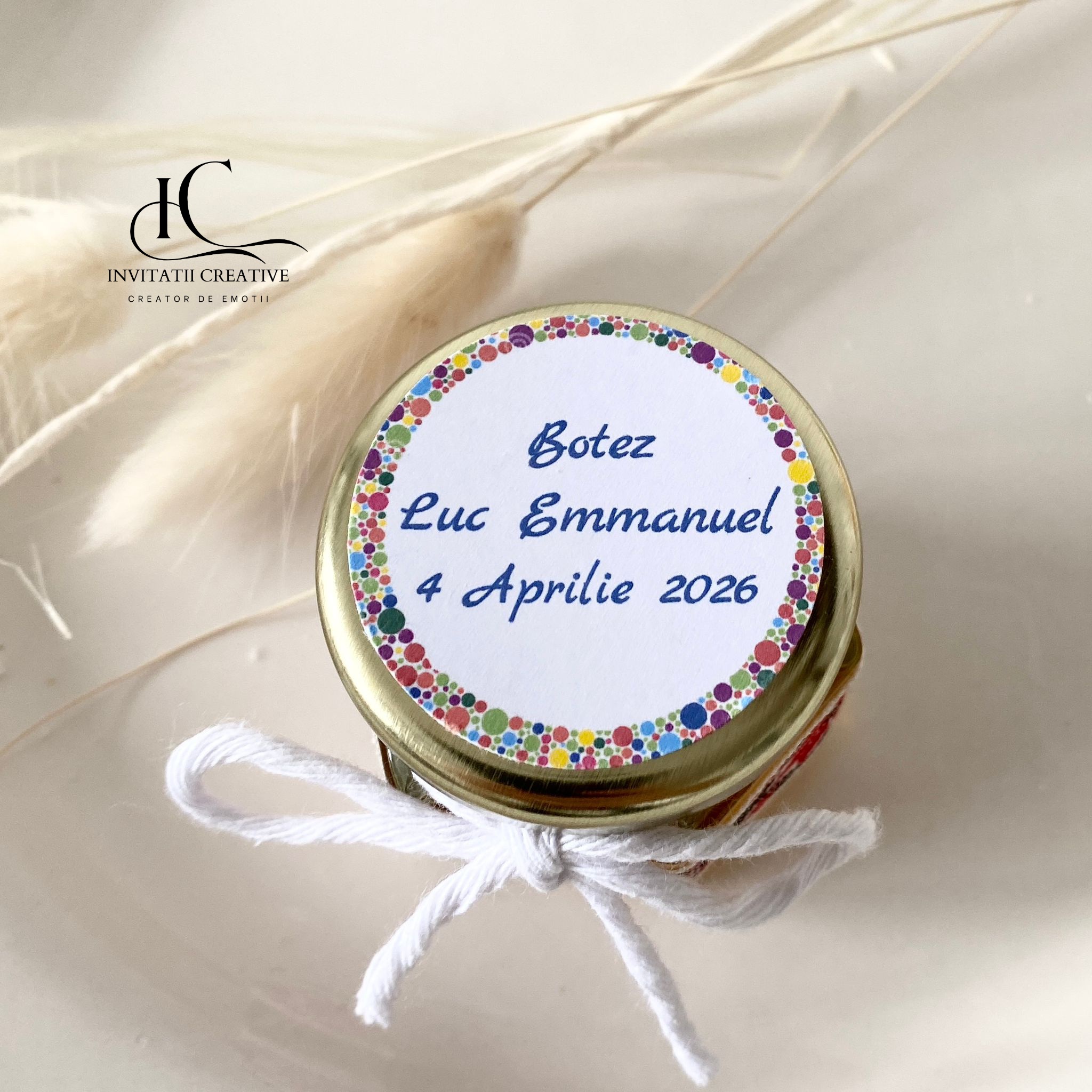 - Etichetă personalizată cu numele mirilor/copilului și data evenimentului
