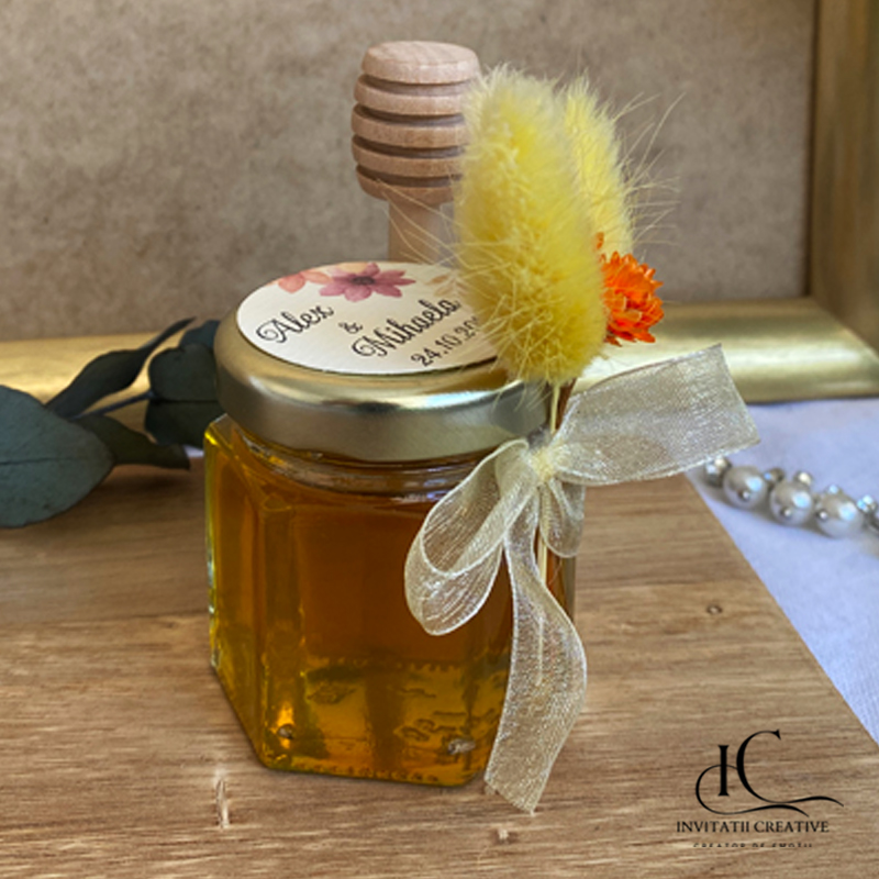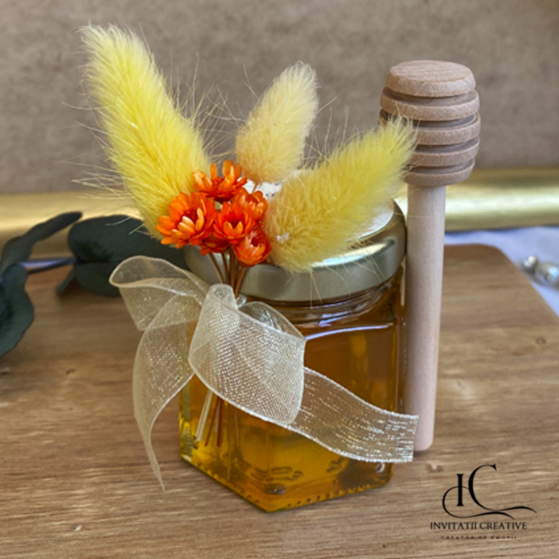 Transformă evenimentul tău într-o poveste parfumată de toamnă cu aceste mărturii elegante: borcănele cu miere polifloră naturală, decorate cu flori uscate în nuanțe calde de galben, orange, arămiu și cărămiziu. Fiecare borcan este personalizat cu etichetă grafică tematică, inspirată din frumusețea sezonului autumnal.
