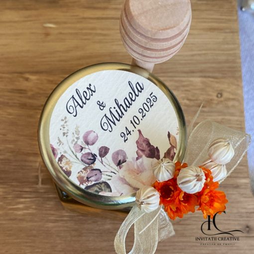 Transformă evenimentul tău într-o poveste parfumată de toamnă cu aceste mărturii elegante: borcănele cu miere polifloră naturală, decorate cu flori uscate în nuanțe calde de galben, orange, arămiu și cărămiziu. Fiecare borcan este personalizat cu etichetă grafică tematică, inspirată din frumusețea sezonului autumnal.