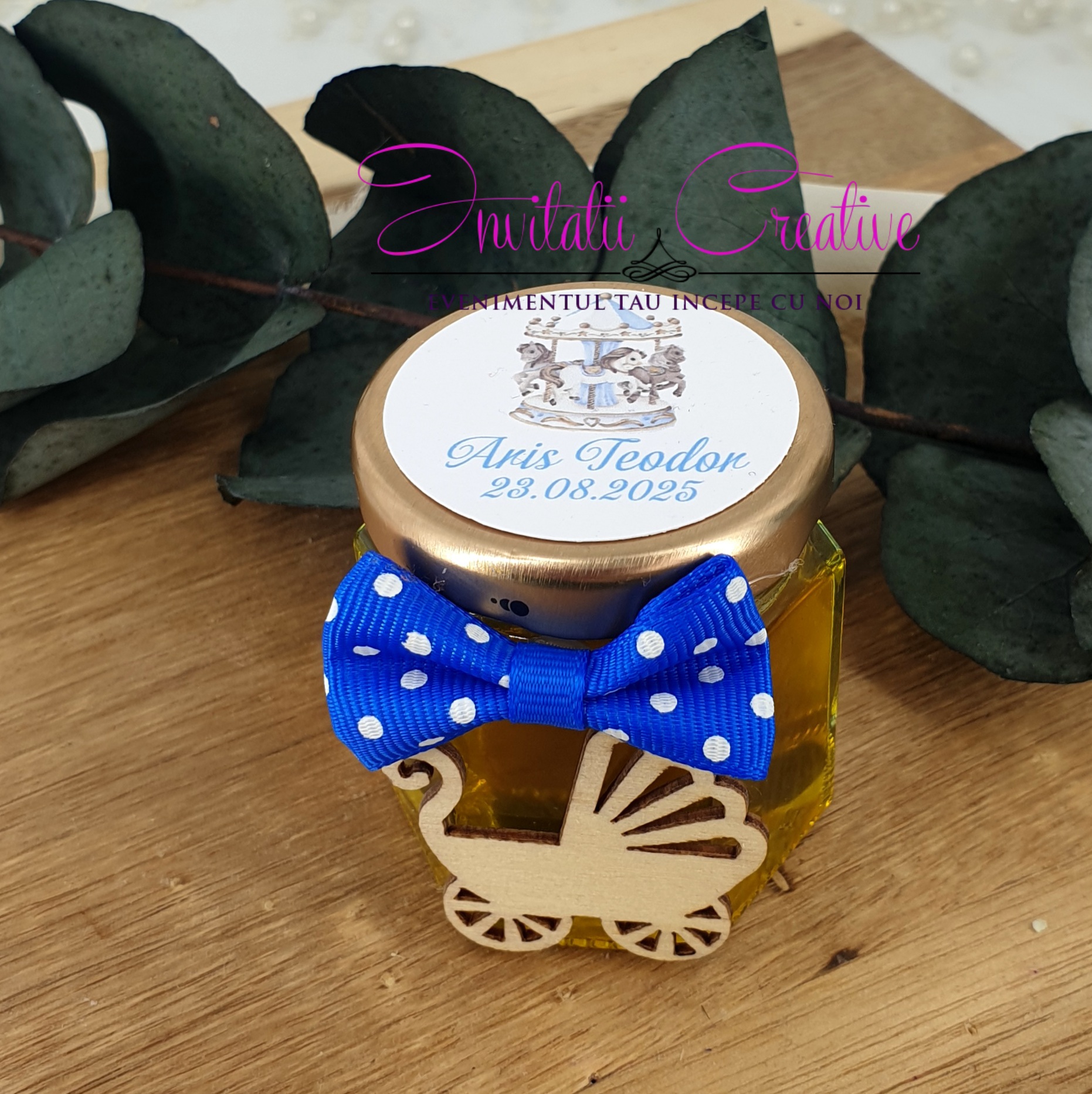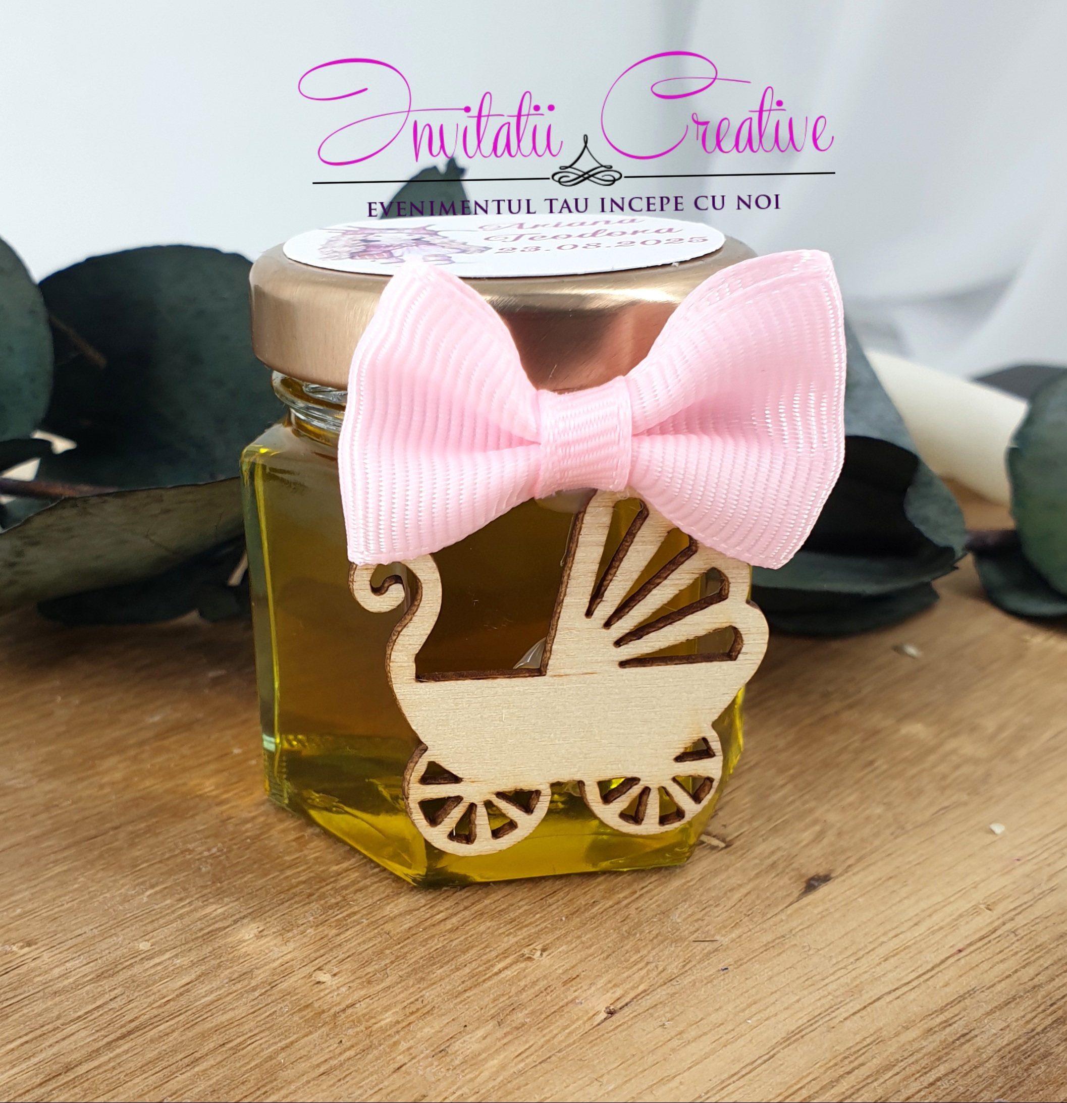 Marturie perfecta pentru invitatii veniti la eveniment. Borcanelul se poate personaliza cu eticheta cu imagine, nume si data, dupa preferinte.*