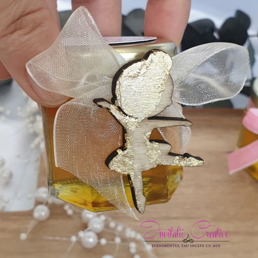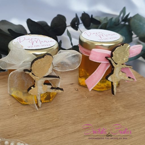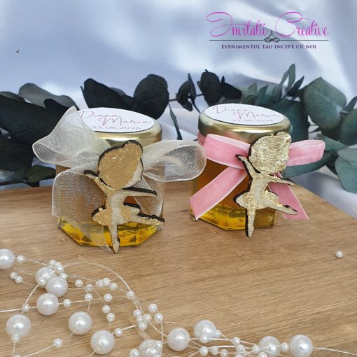 🎀 Ce face acest borcănel special? ✔ Conține miere polifloră, un dar autentic al naturii, plin de savoare și binecuvântare. ✔ Este ornat cu fundițe delicate, care adaugă un aer sofisticat și festiv. ✔ Accesorizat cu o fundiță si o balerina din lemn decorata manual cu foita aurie, detalii care transformă această mărturie într-un veritabil simbol al eleganței și rafinamentului.