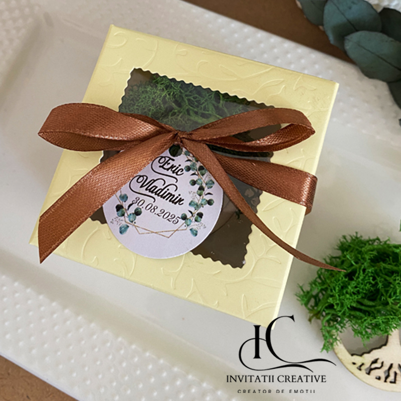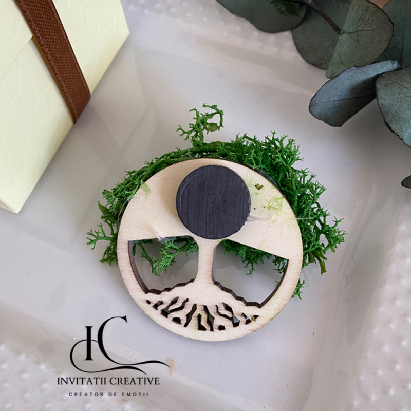 Fiecare copăcel este ambalat elegant în cutiuță, personalizat cu etichetă și fundiță, și ascunde un mic secret: un magnet pe spate! Astfel, invitații tăi îl pot păstra mereu la vedere, pe frigider sau birou, amintindu-și de ziua voastră specială.