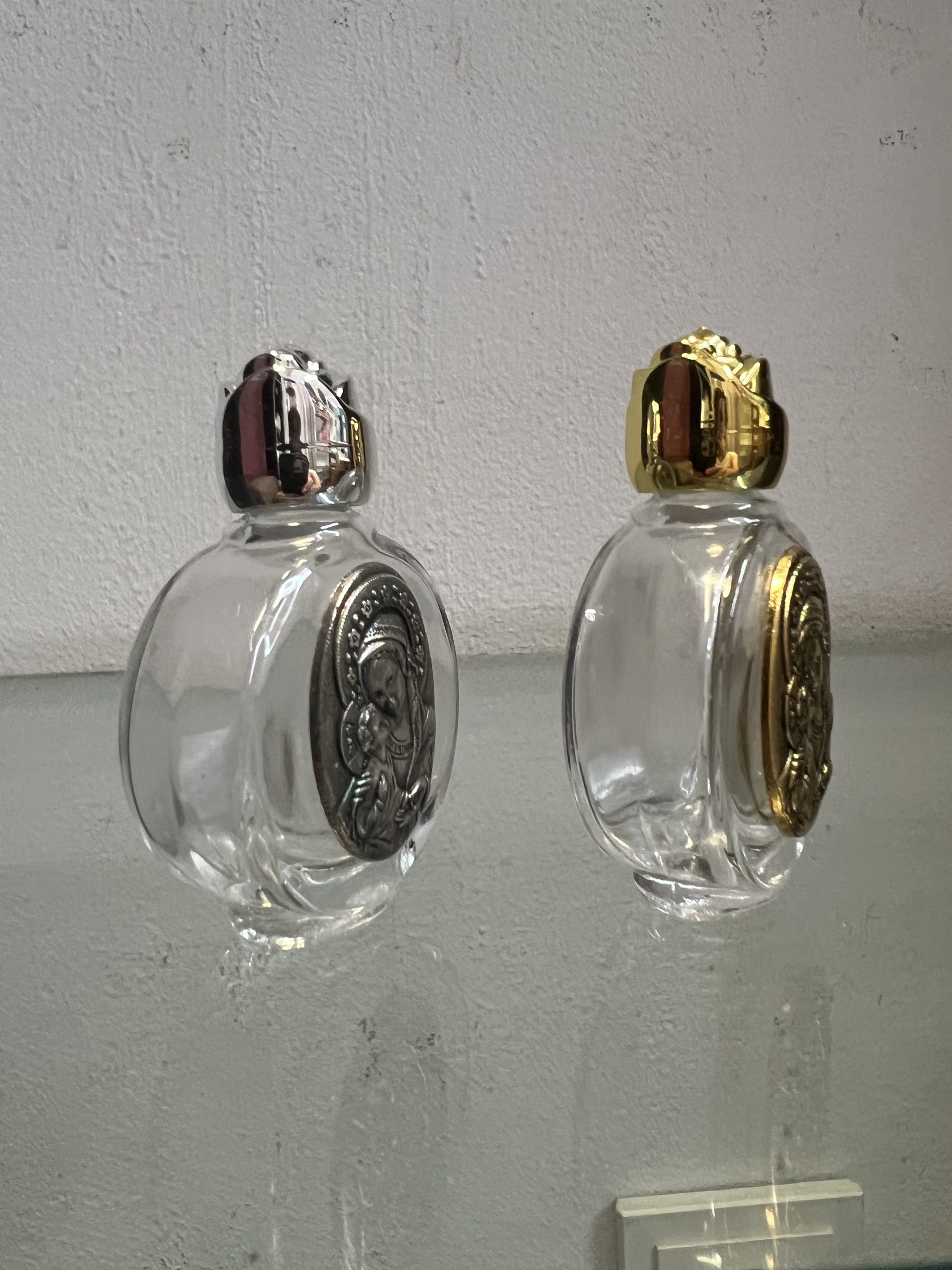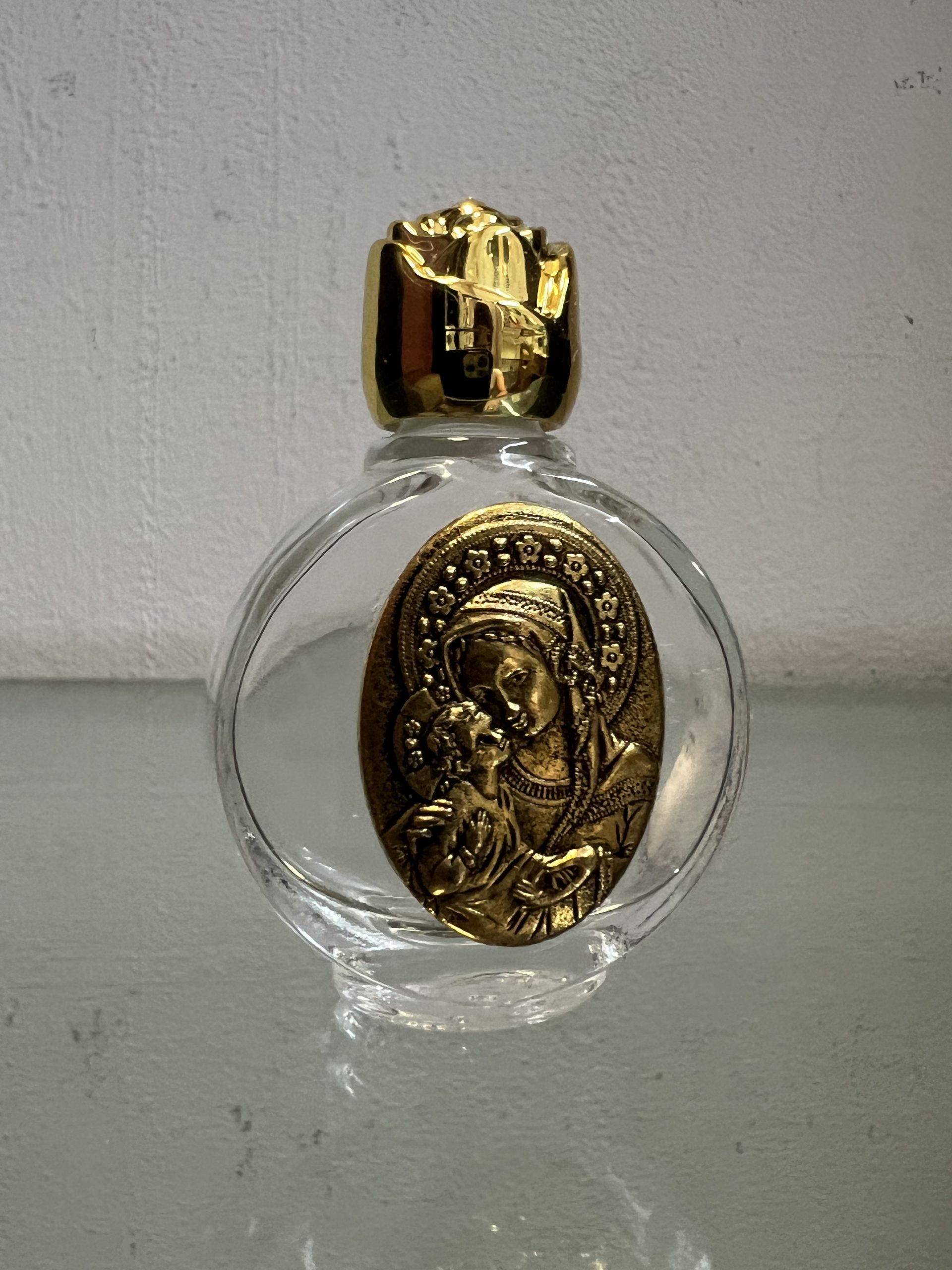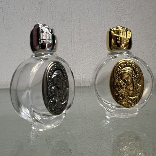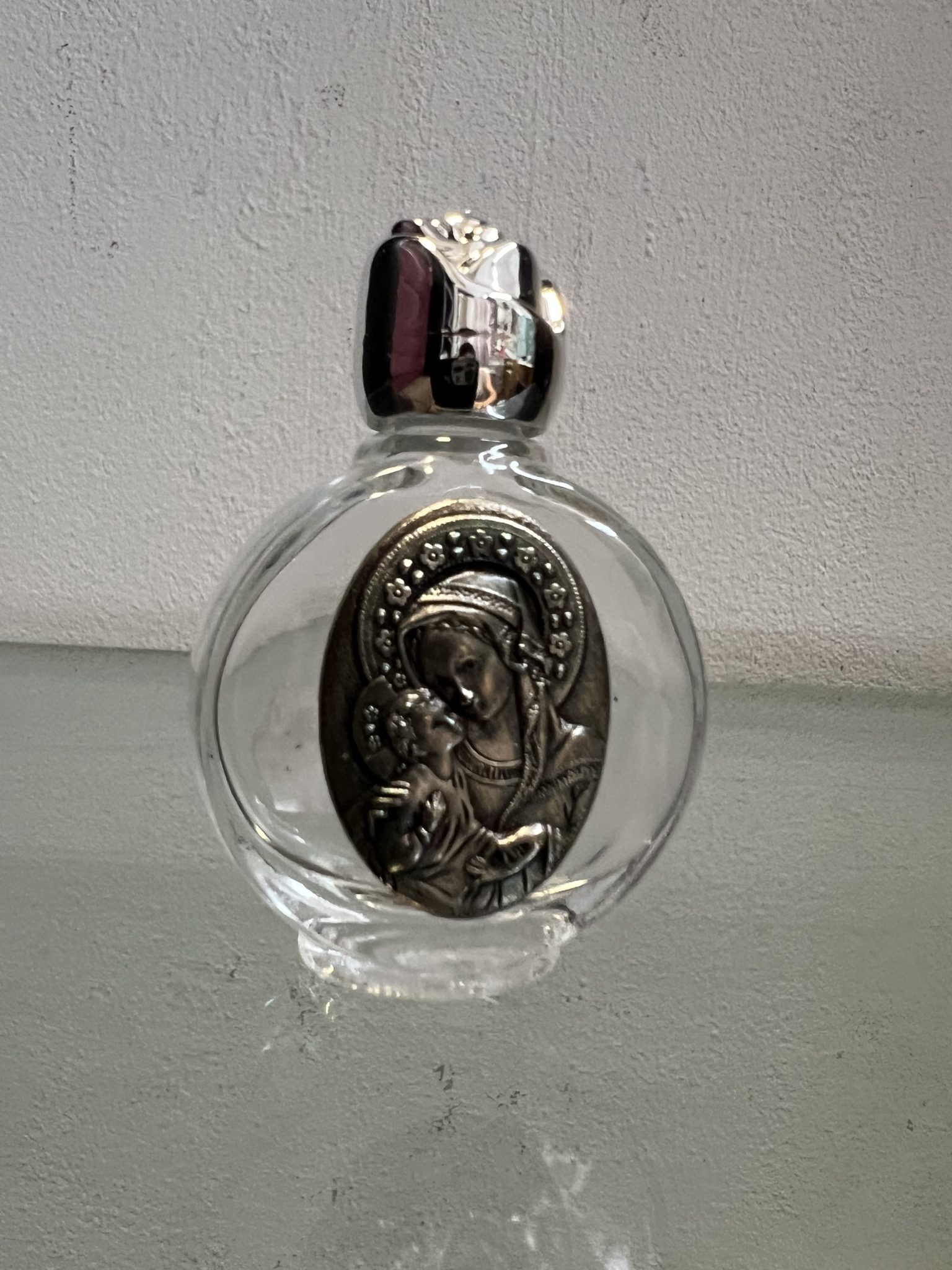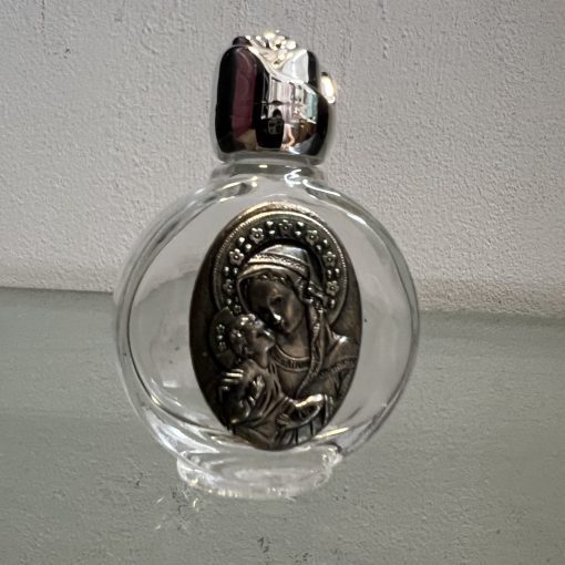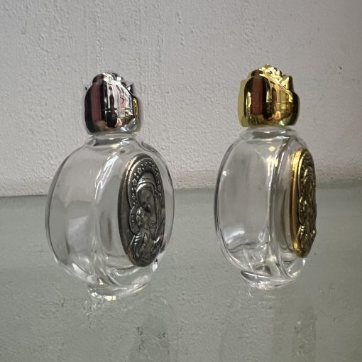 Marturie Botez Sticluta Mir cu Iconita Maica Domnului. Sticluta cu capac din plastic argintiu cu aplicatie iconita poate fi folosita ca sticluta cu mir la botezul copilului sau marturie. Iconita are aspect vintage (invechit).