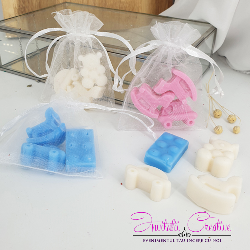 Marturie Botez Tablete Aromaterapie Figurine Jucarii. Marturiile vin ambalate cate 3 bucati, 4 modele amestecate (ursulet, masinuta, forma lego si calut carusel). Puteti alege parfumul si culoarea dorite din optiuni.Tabletele Aromaterapie sunt realizate din ceară de soia, turnate manual, cu drag, în forme diferite, pentru a oferi un spectacol olfactiv intens*, atunci când se topesc în difuzorul de arome sau sunt puse in dulapul de haine sau de prosoape.