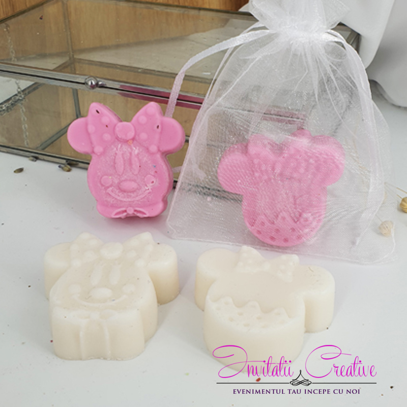 Marturie Botez Tablete Aromaterapie Minnie Mouse. Marturiile vin amestecate 2* modele si puteti alege parfumul si culoarea dorite din optiuni.Tabletele Aromaterapie sunt realizate din ceară de soia, turnate manual, cu drag, în forme diferite, pentru a oferi un spectacol olfactiv intens*, atunci când se topesc în difuzorul de arome sau sunt puse in dulapul de haine sau de prosoape.
