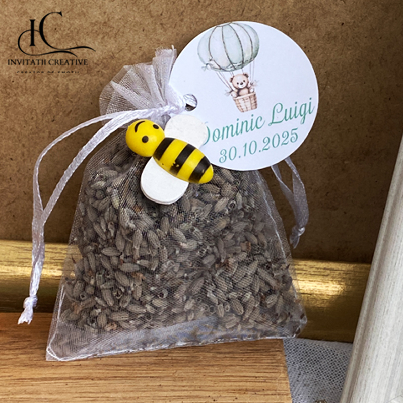 Oferă invitaților tăi o amintire delicată și parfumată, care să le aducă zâmbetul pe buze de fiecare dată când o privesc. Mărturiile cu săculeți din organza umpluți cu lavandă naturală îmbină frumusețea estetică cu aroma relaxantă a florilor, creând un cadou simbolic și util.