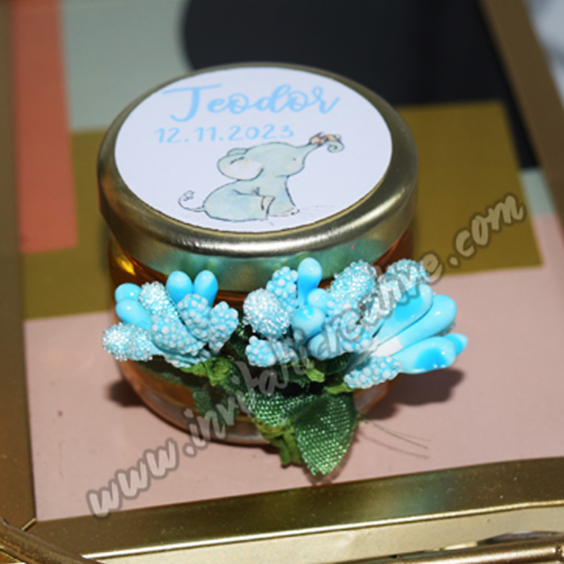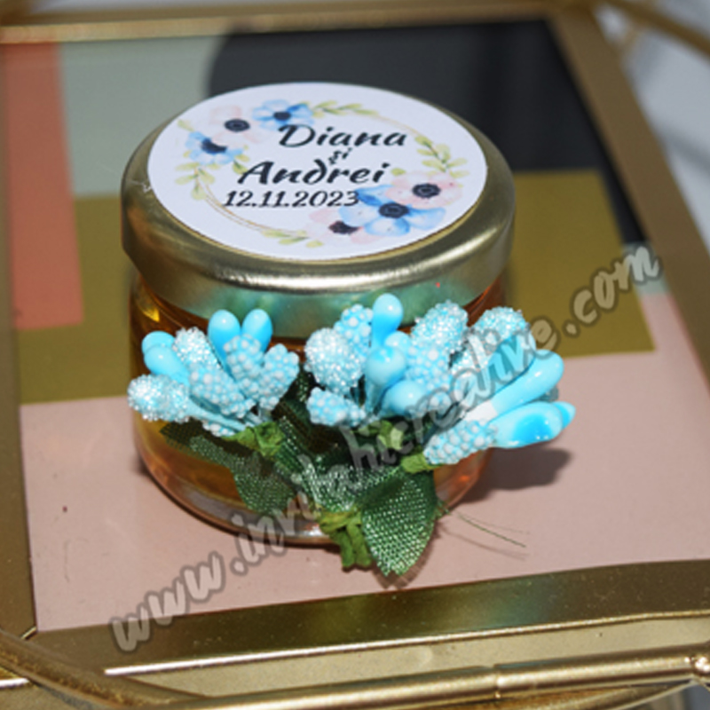 Marturie Borcanel Miere cu Buchetel de Flori Bleu deosebita si eleganta, cu siguranta va fi apreciata de catre invitatii veniti la frumosul eveniment.