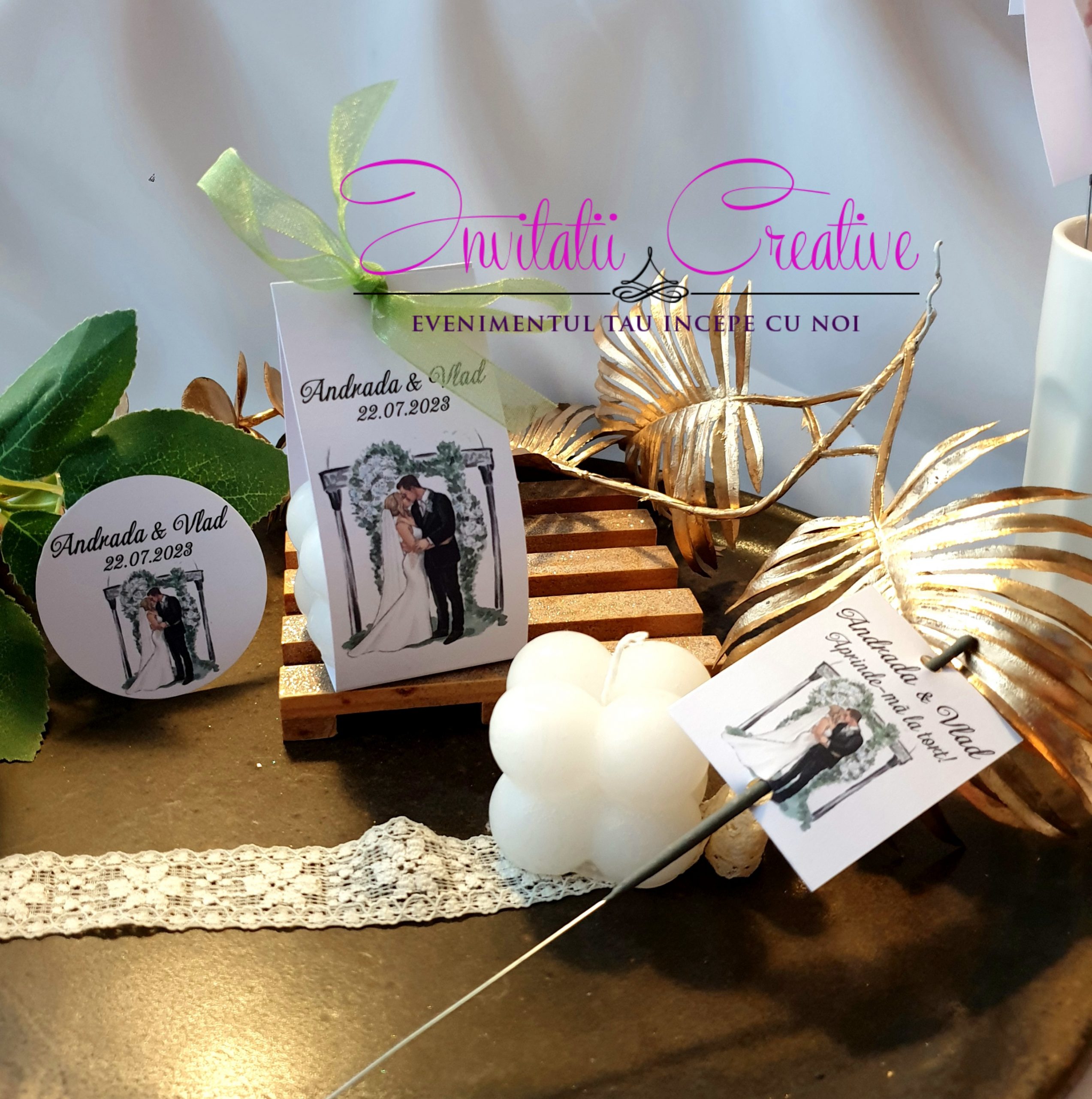 Daca aveti un eveniment tematic si doriti toate produsele asortate puteti opta pentru setul format din invitatie, plic de bani, meniu si numar de masa cu acelasi design. Pentru detalii ne puteti contacta telefonic (0736 035 159,0756 237 365), pe email (office@invitatiicreative.com) sau pe chat-ul de pe site.