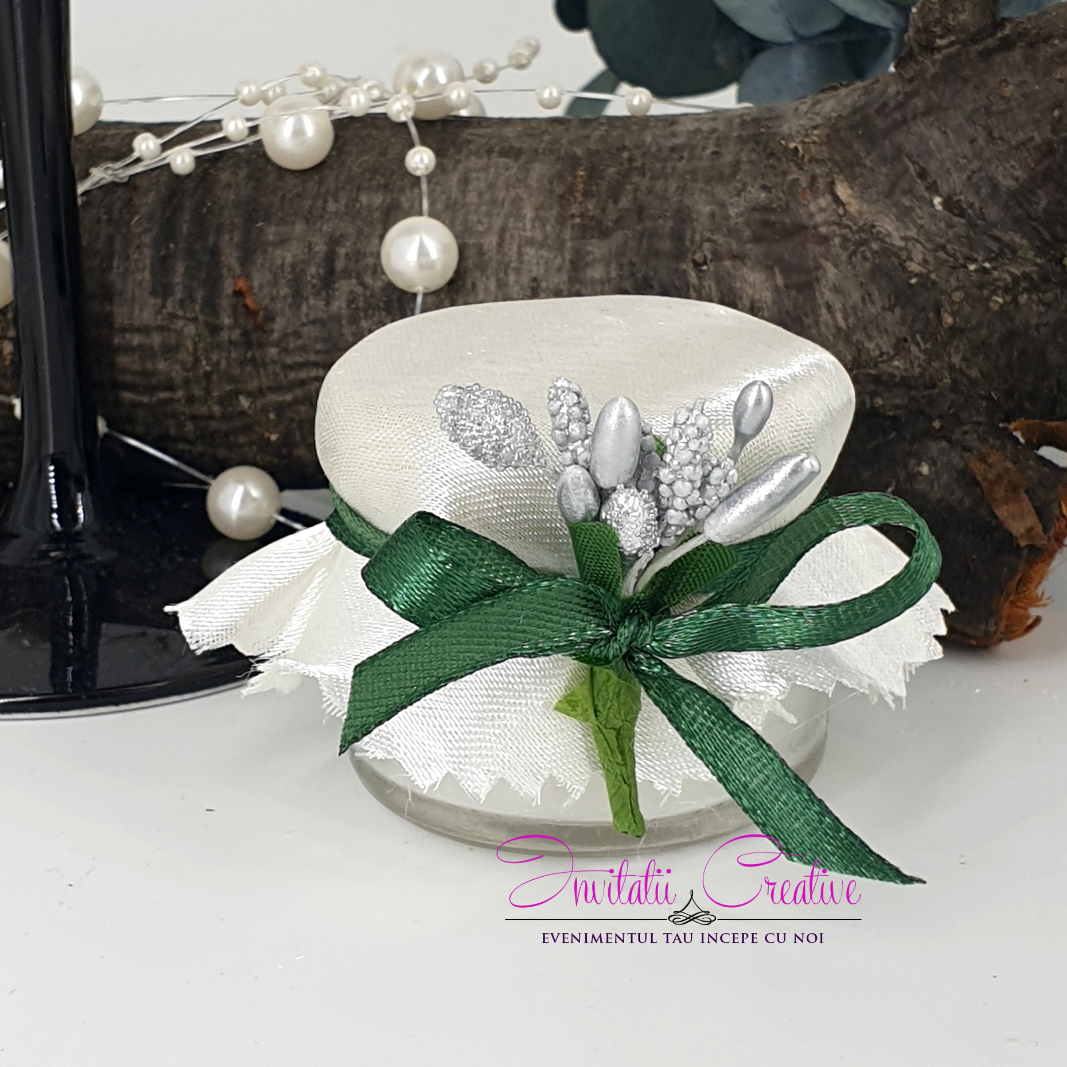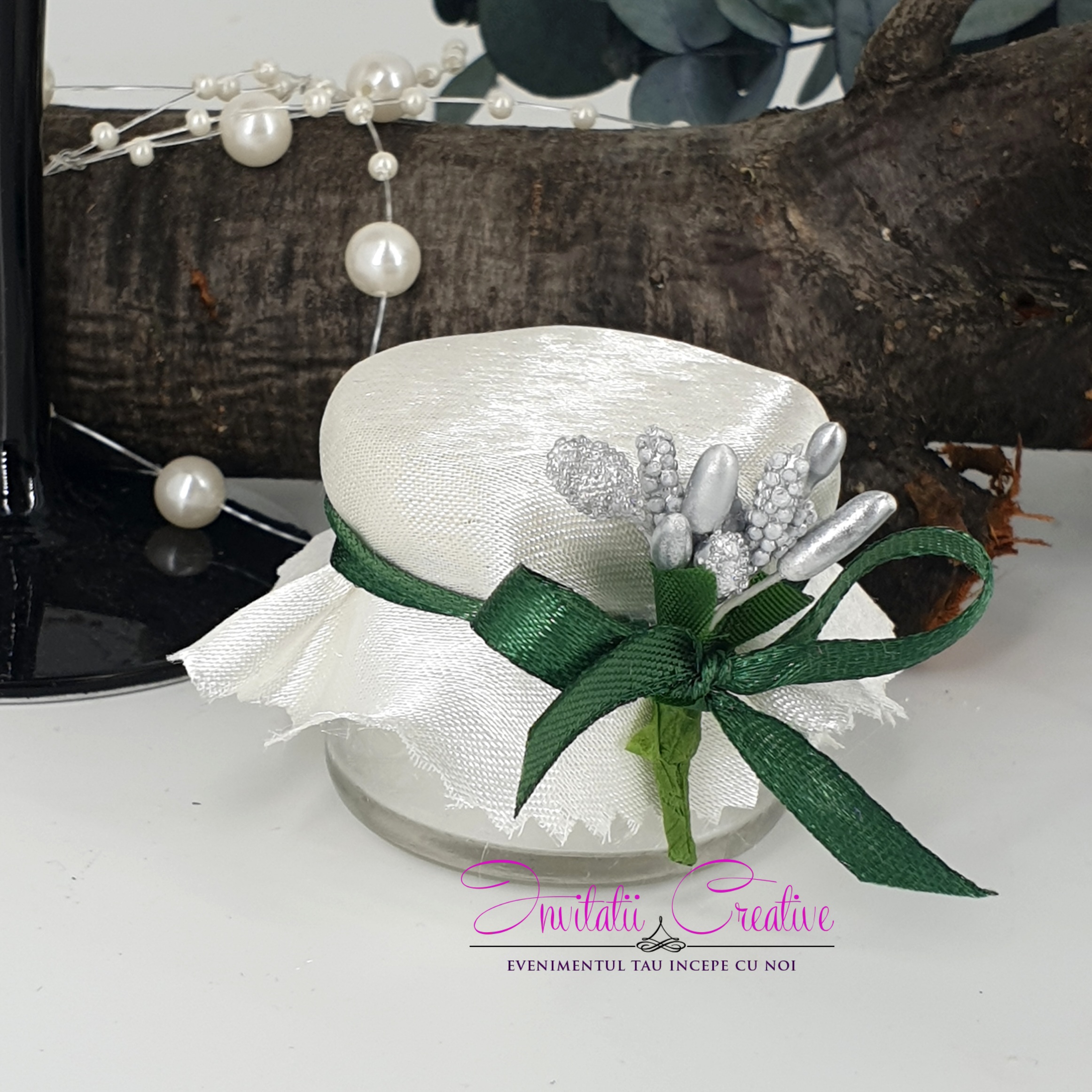 Marturie Lumanare Parfumata Alb-Verde cu Flori Argintii