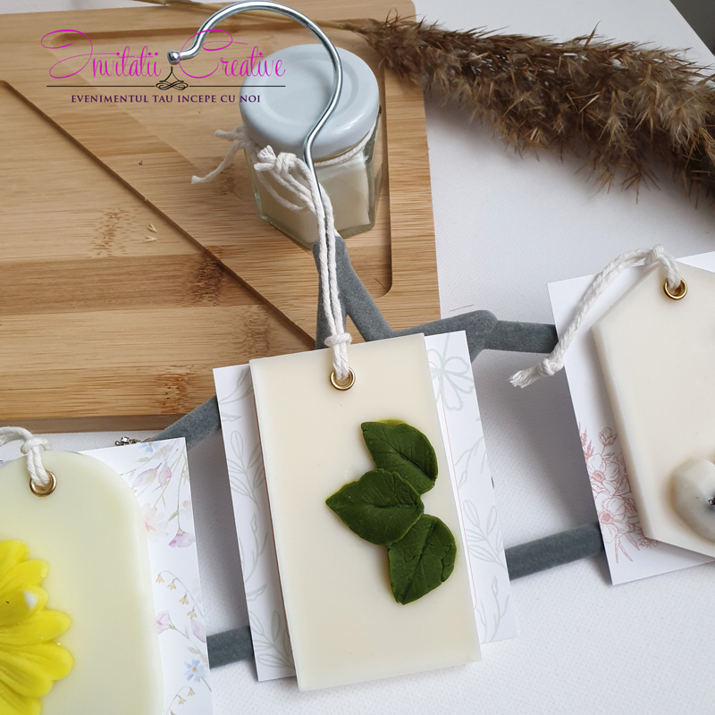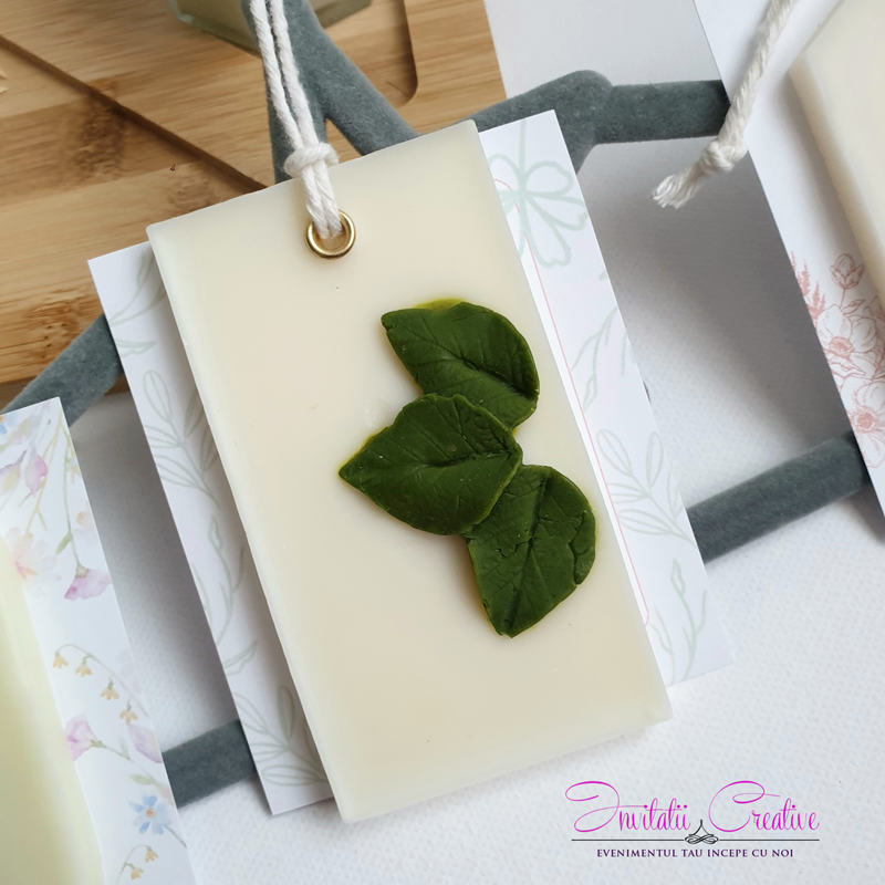Mărturii nuntă/botez – Ornament parfumat/odorizant dulap, ceară soia pură-Mărturie de nuntă odorizant natural din ceară de soia cu frunze