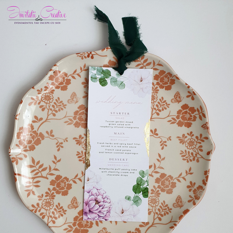 Meniu individual cu flori pastel si foita aurie