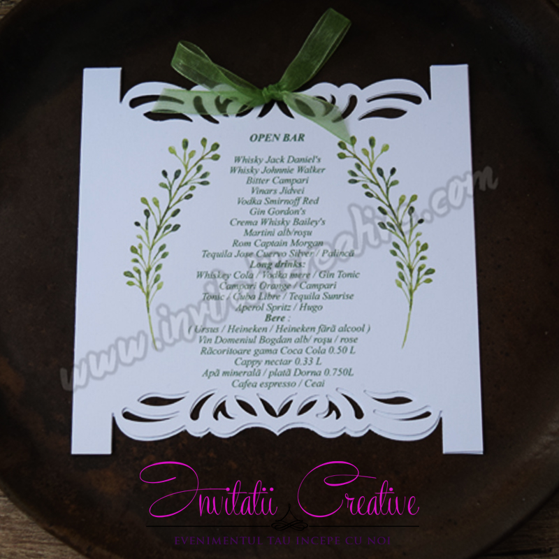 Meniu Nunta Elegant LaserCut cu Frunze Acuarela si Fundita