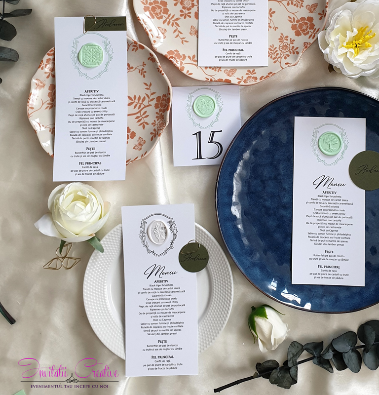 Putem realiza setul de papetarie in aceeasi tematica (plic de bani, meniu, invitatie, placecard, lista invitati / opis, numar masa, etichete marturii, marturii).
