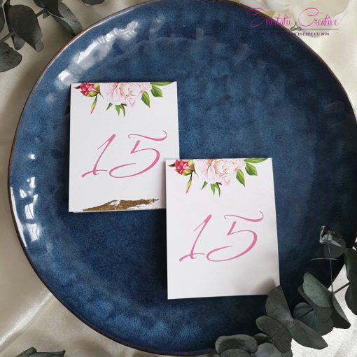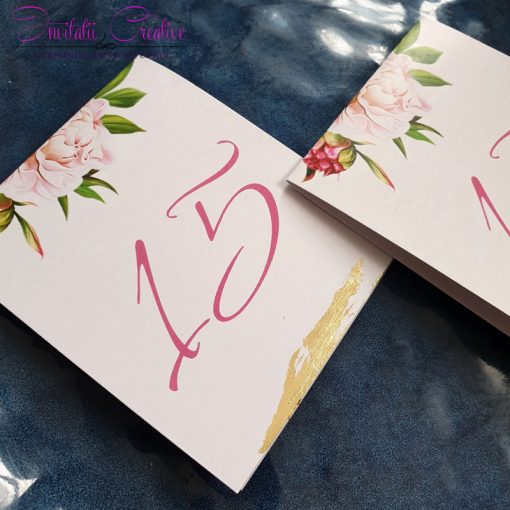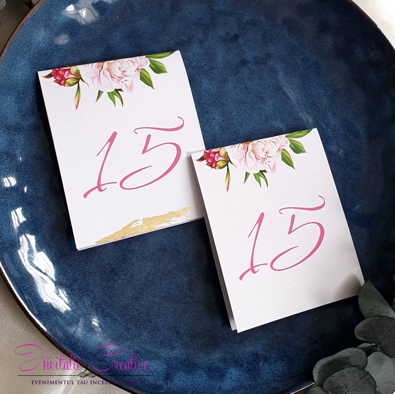 Acest număr de nuntă tip carte, realizat din carton mat de 300g, este alegerea perfectă pentru o atmosferă sofisticată și bine organizată. Decorat cu flori delicate în nuanțe pastel, completează armonios decorul meselor și adaugă un aer romantic evenimentului.