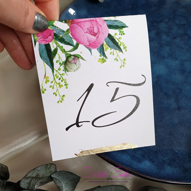 Acest număr de nuntă tip carte, realizat din carton mat de 300g, este alegerea perfectă pentru o atmosferă sofisticată și bine organizată. Decorat cu flori delicate în nuanțe pastel, completează armonios decorul meselor și adaugă un aer romantic evenimentului.