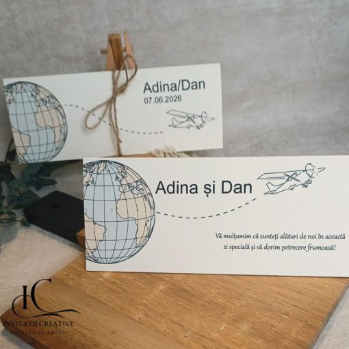 Putem realiza setul de papetarie in aceeasi tematica (plic de bani, meniu, invitatie, placecard, lista invitati / opis, numar masa, etichete marturii, marturii).