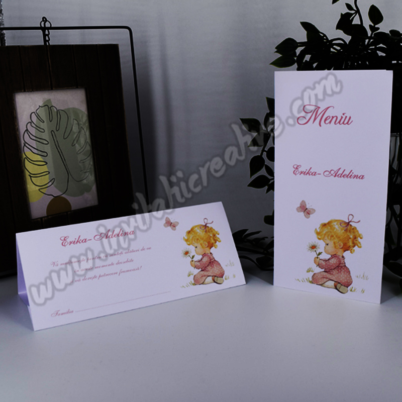 Putem realiza setul de papetarie in aceeasi tematica (plic de bani, meniu, invitatie, placecard, lista invitati / opis, numar masa, etichete marturii, marturii).