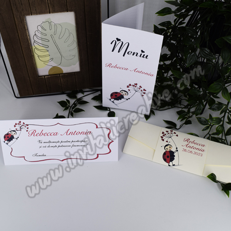 Putem realiza setul de papetarie in aceeasi tematica (plic de bani, meniu, invitatie, placecard, lista invitati / opis, numar masa, etichete marturii, marturii).