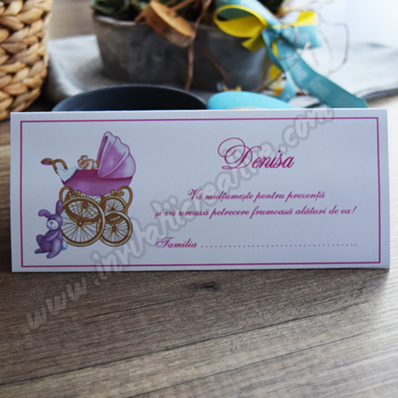 Putem realiza setul de papetarie in aceeasi tematica (plic de bani, meniu, invitatie, placecard, lista invitati / opis, numar masa, etichete marturii, marturii).