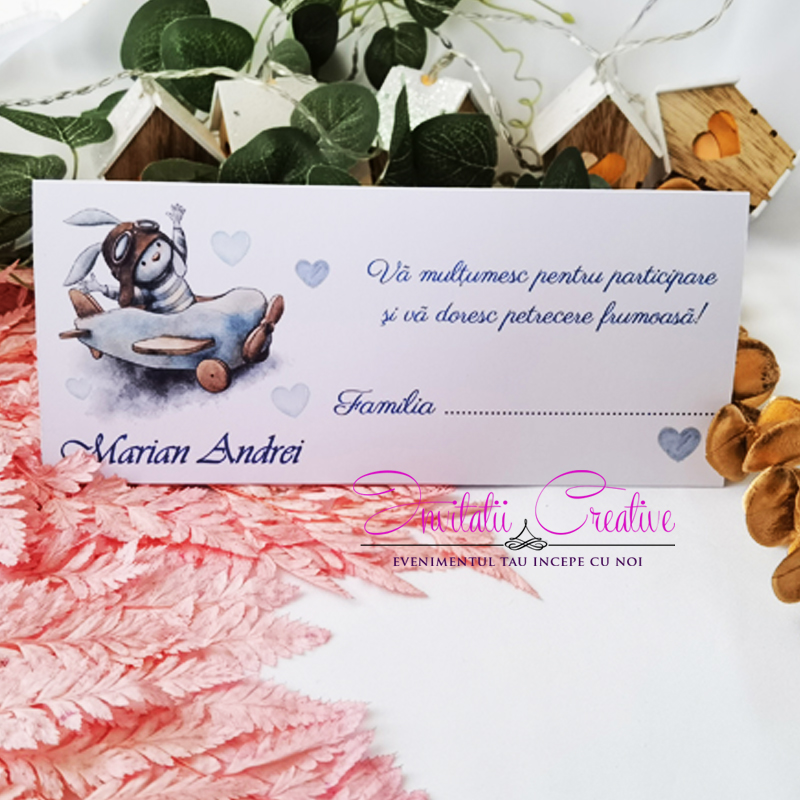 Putem realiza setul de papetarie in aceeasi tematica (plic de bani, meniu, invitatie, placecard, lista invitati / opis, numar masa, etichete marturii, marturii).