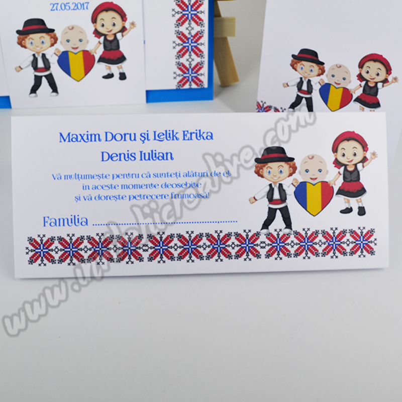 Putem realiza setul de papetarie in aceeasi tematica (plic de bani, meniu, invitatie, placecard, lista invitati / opis, numar masa, etichete marturii, marturii).