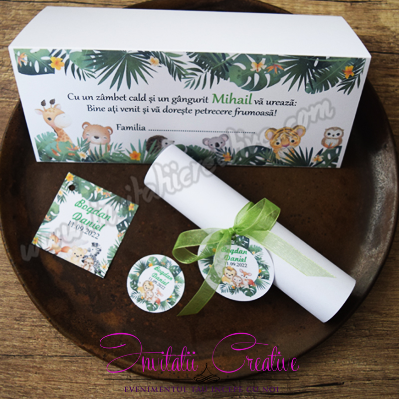Daca aveti un eveniment tematic si doriti toate produsele asortate puteti opta pentru setul format din invitatie, plic de bani, meniu si numar de masa cu acelasi design. Pentru detalii ne puteti contacta telefonic (0736 035 159,0756 237 365), pe email (office@invitatiicreative.com) sau pe chat-ul de pe site.