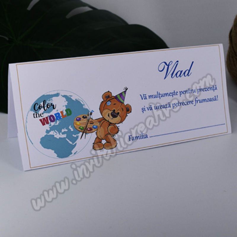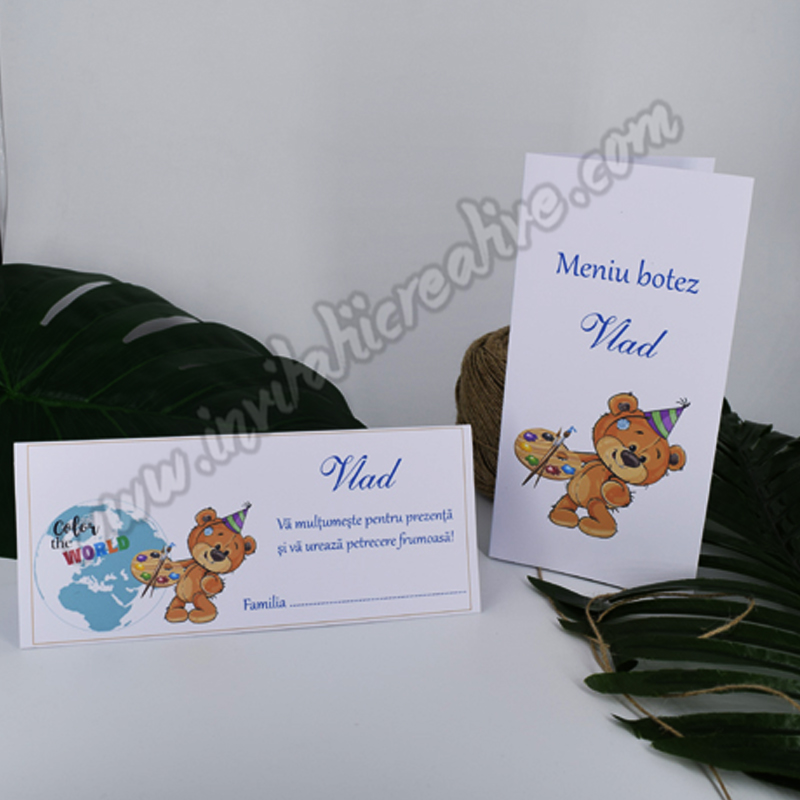 Putem realiza setul de papetarie in aceeasi tematica (plic de bani, meniu, invitatie, placecard, lista invitati / opis, numar masa, etichete marturii, marturii).