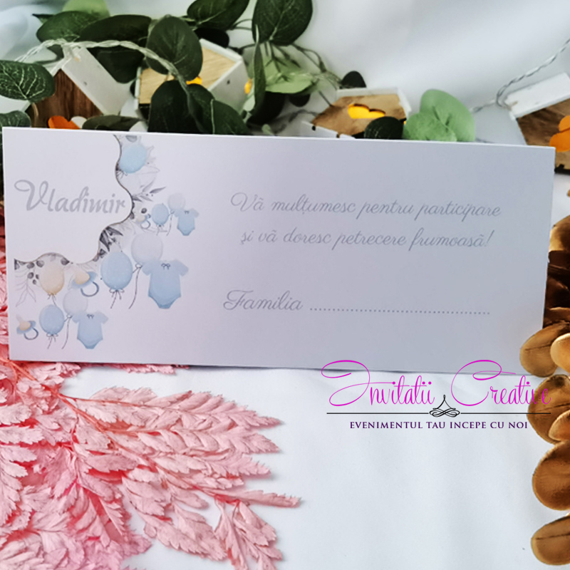Putem realiza setul de papetarie in aceeasi tematica (plic de bani, meniu, invitatie, placecard, lista invitati / opis, numar masa, etichete marturii, marturii).