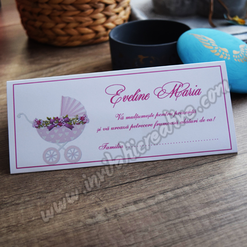 Putem realiza setul de papetarie in aceeasi tematica (plic de bani, meniu, invitatie, placecard, lista invitati / opis, numar masa, etichete marturii, marturii).