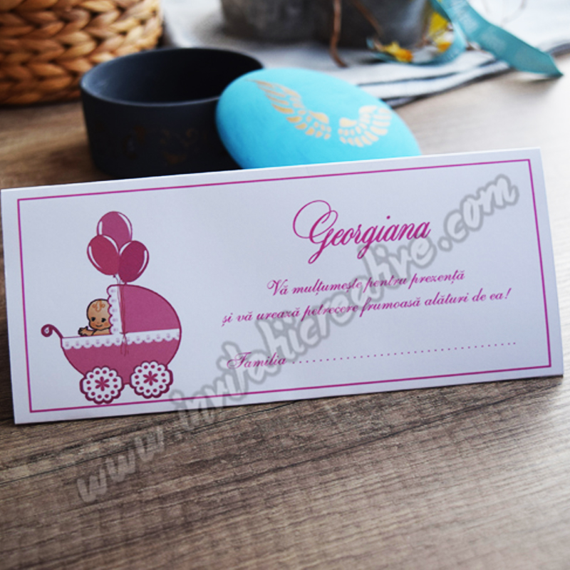 Putem realiza setul de papetarie in aceeasi tematica (plic de bani, meniu, invitatie, placecard, lista invitati / opis, numar masa, etichete marturii, marturii).