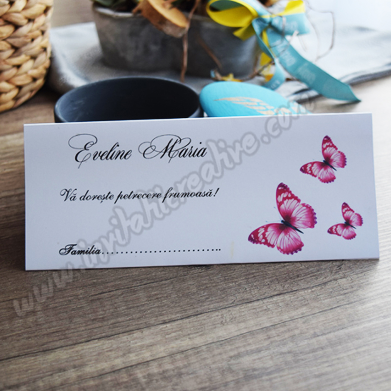 Putem realiza setul de papetarie in aceeasi tematica (plic de bani, meniu, invitatie, placecard, lista invitati / opis, numar masa, etichete marturii, marturii).