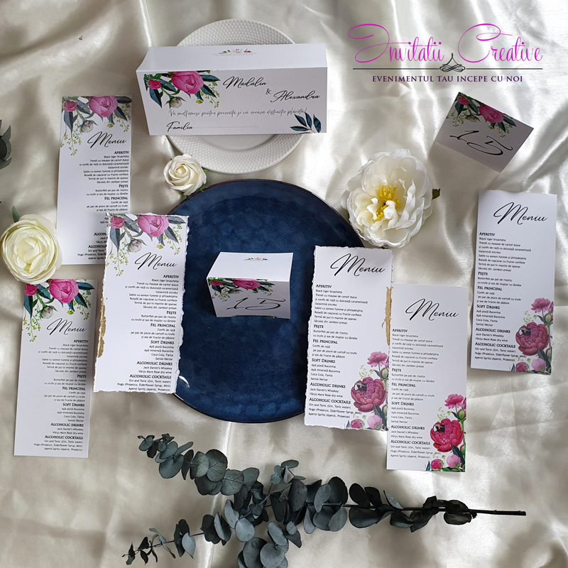 Putem realiza setul de papetarie in aceeasi tematica (plic de bani, meniu, invitatie, placecard, lista invitati / opis, numar masa, etichete marturii, marturii).