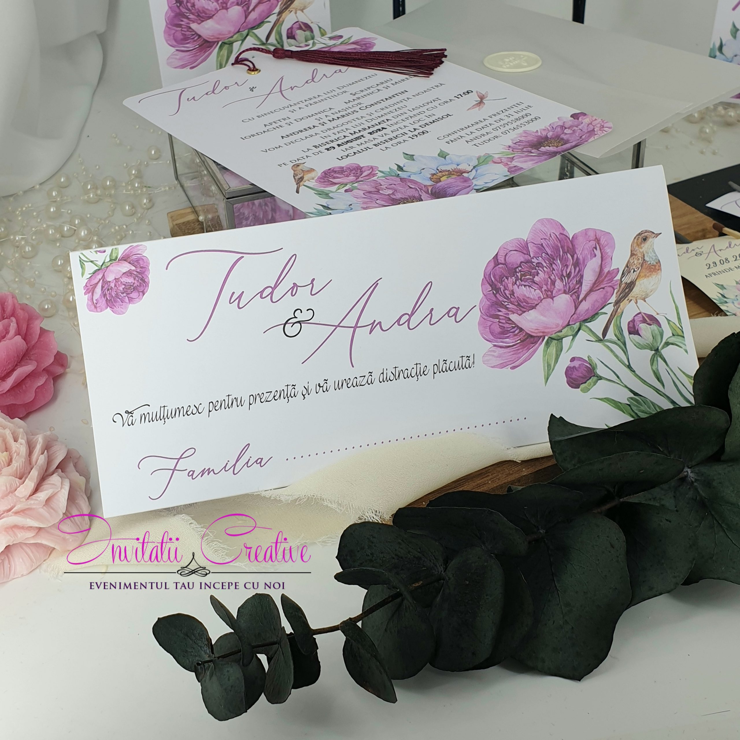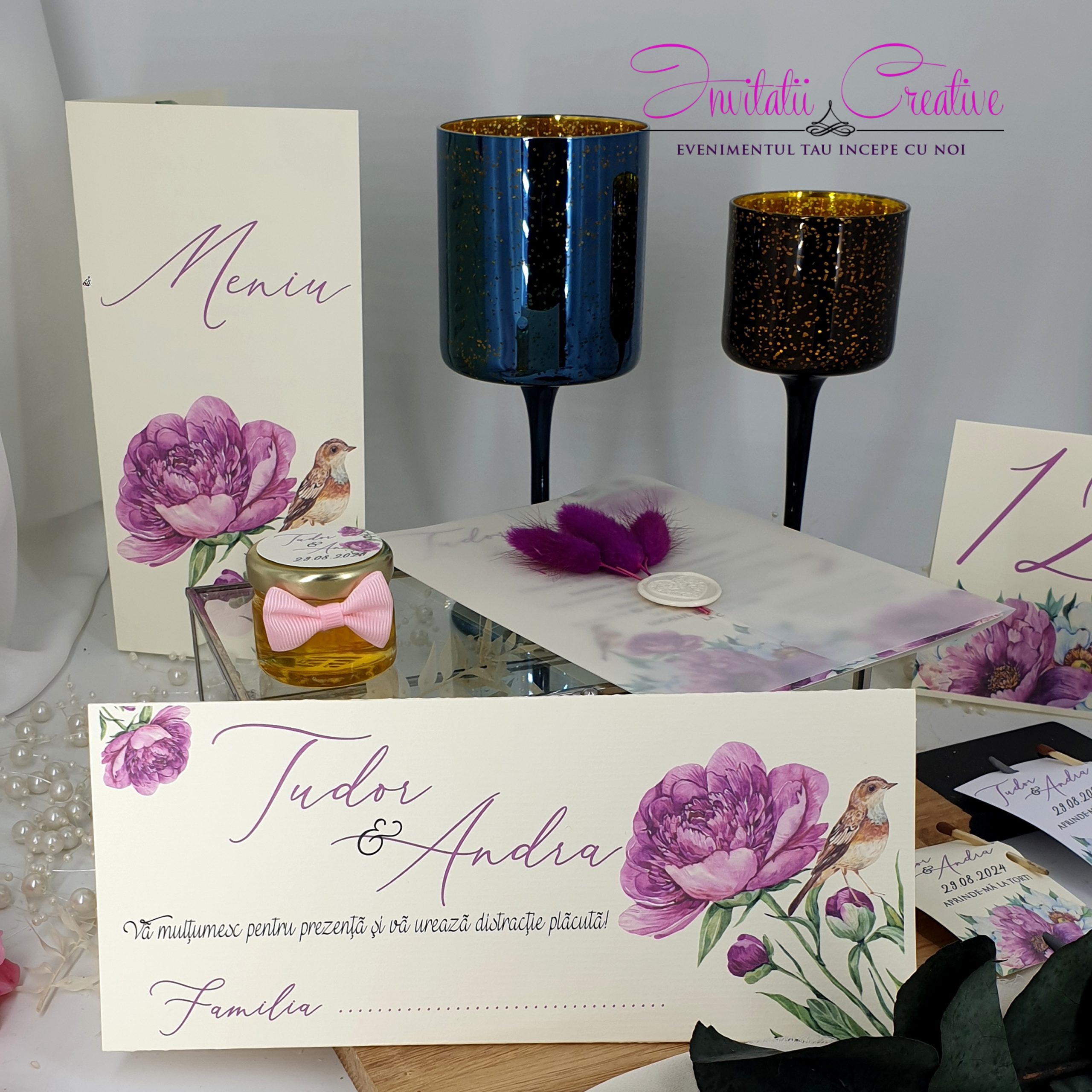 Daca aveti un eveniment tematic si doriti toate produsele asortate puteti opta pentru setul format din invitatie, plic de bani, meniu si numar de masa cu acelasi design. Pentru detalii ne puteti contacta telefonic (0736 035 159,0756 237 365), pe email (office@invitatiicreative.com) sau pe chat-ul de pe site.