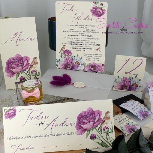 Putem realiza setul de papetarie in aceeasi tematica (plic de bani, meniu, invitatie, placecard, lista invitati / opis, numar masa, etichete marturii, marturii).