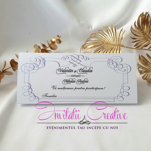 Culoarea designului se poate schimba gratuit cu orice culoare, exceptand auriu sau argintiu. Asortat cu restul papetariei si cu decorul locatiei, transmiți stil, bun gust și respect profund față de invitatii tau.