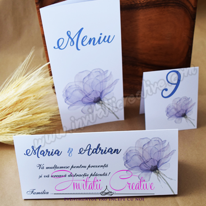 Putem realiza setul de papetarie in aceeasi tematica (plic de bani, meniu, invitatie, placecard, lista invitati / opis, numar masa, etichete marturii, marturii).