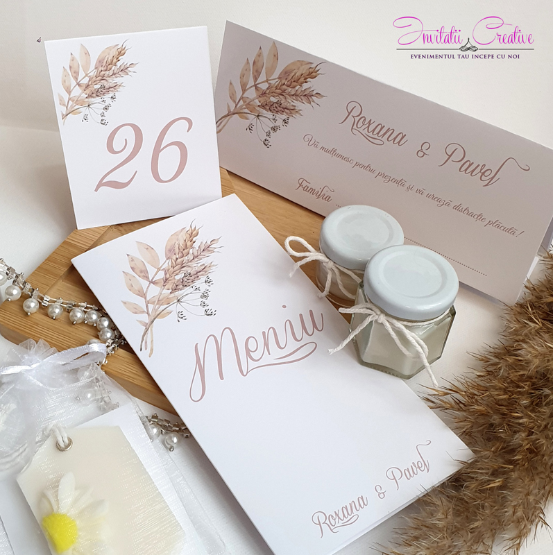 Putem realiza setul de papetarie in aceeasi tematica (plic de bani, meniu, invitatie, placecard, lista invitati / opis, numar masa, etichete marturii, marturii).