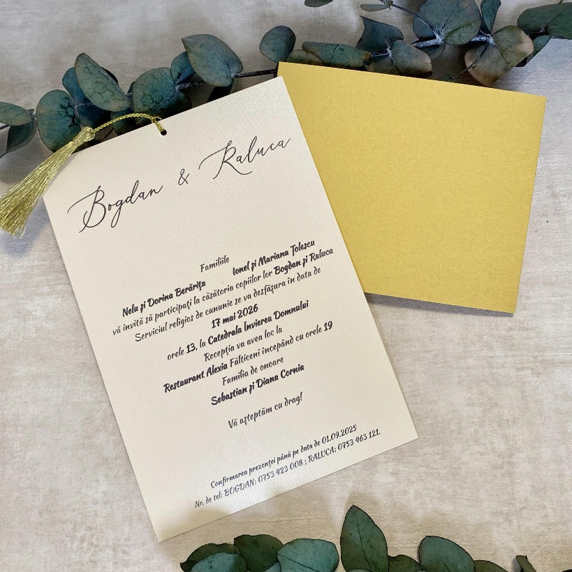 Invitatiile sunt realizate din carton de 300 gr, cu design elegant, accesorizate cu ciucurasi si carton sidefat auriu.