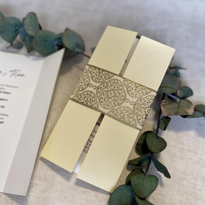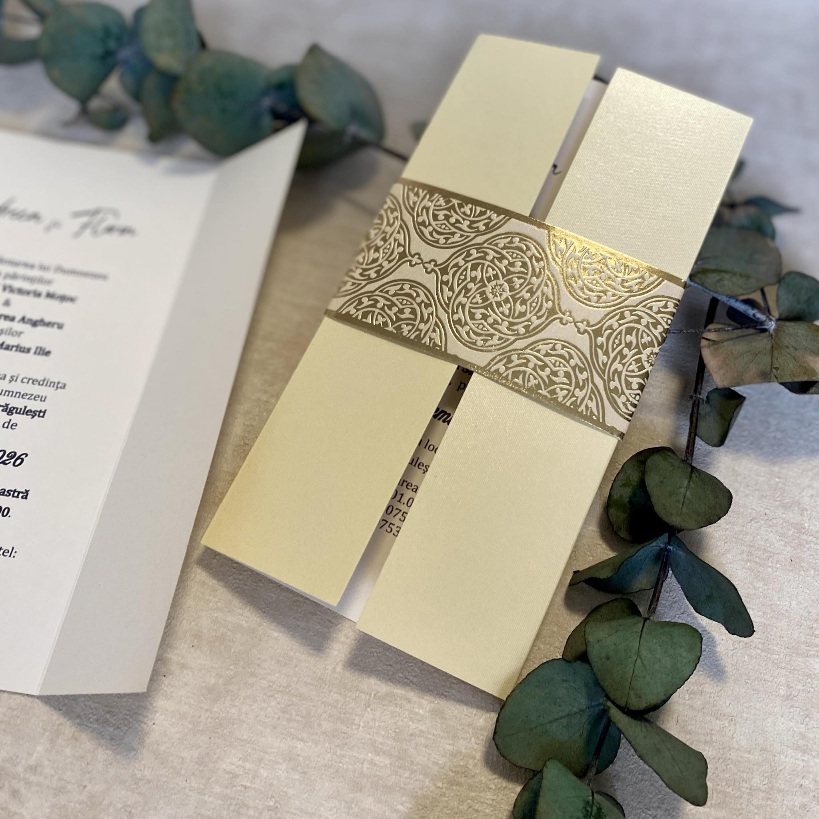 Invitatiile sunt realizate din carton de 300 gr cu, pliat si inchis cu o banderola cu motiv elegant auriu.