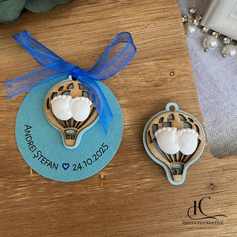Marturii de botez magnet cu balon aer cald bleu