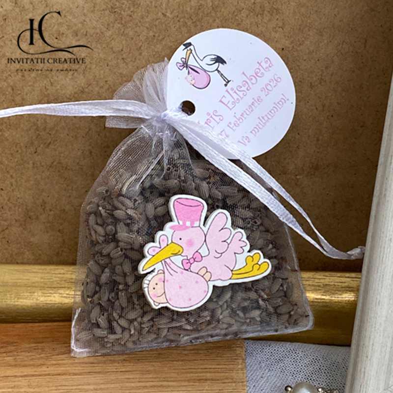 Marturii saculeti cu lavanda barza cu fetita in cioc