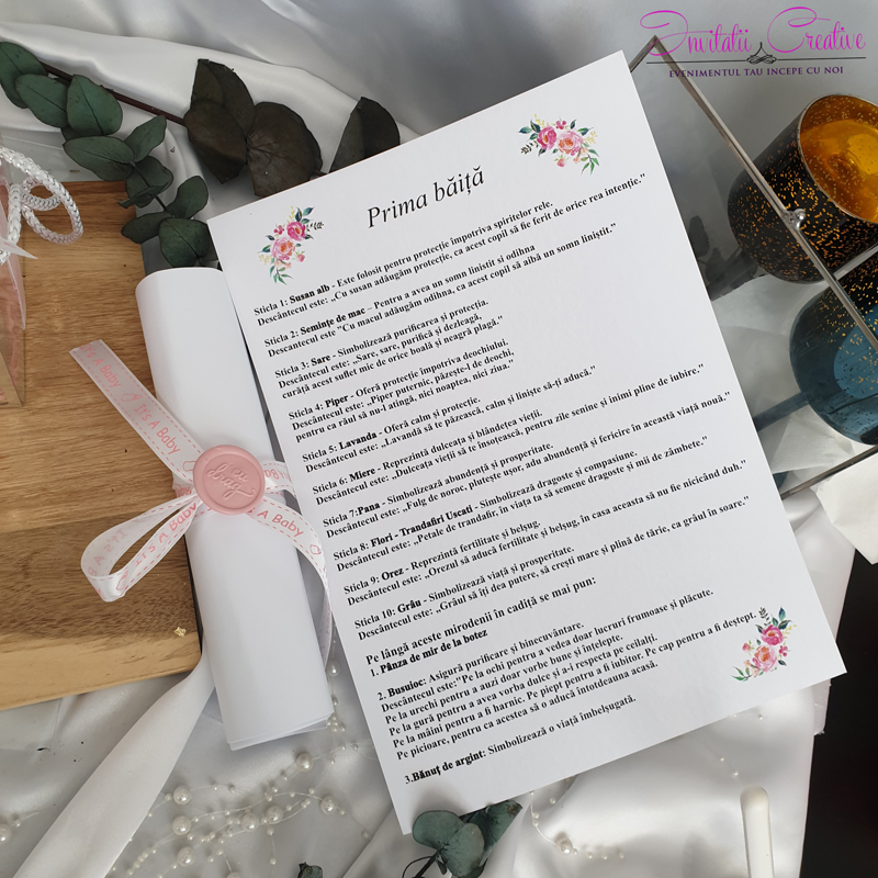 Set de mirodenii pentru prima baita cu nasii Baby Girl este destinat utilizării în cadrul ritualului tradițional pentru baita de mir, desfășurat a doua zi după botez. Acest ritual este un moment plin de simbolism și emoție, în care copilul este curățat și binecuvântat, de nasi pentru a începe viața cu noroc, binecuvantare si sanatate.