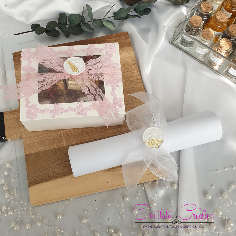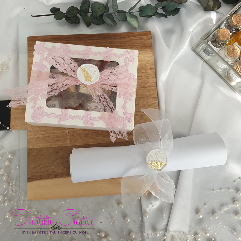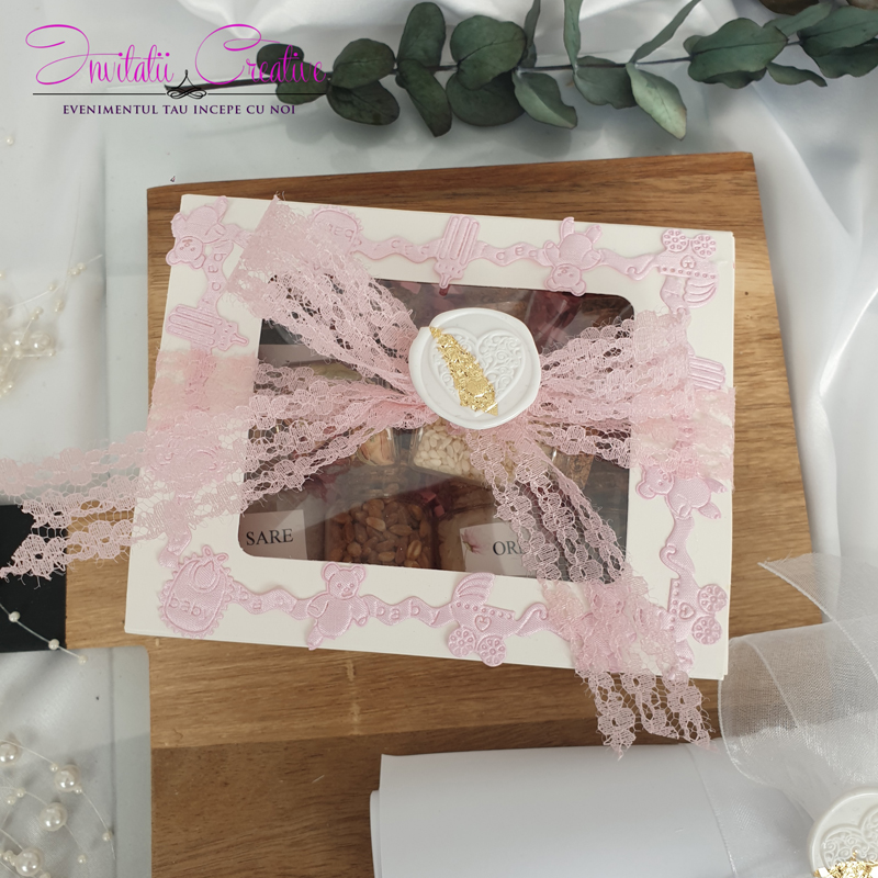 Această cutie elegantă este perfectă pentru a păstra toate ingredientele pentru prima băiță de dupa botez, fiind în același timp un obiect de decor rafinat. Accesorizata cu o panglica si cu sigiliu pentru a o face si mai deosebita.