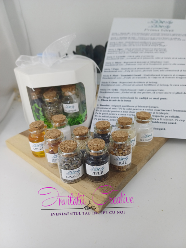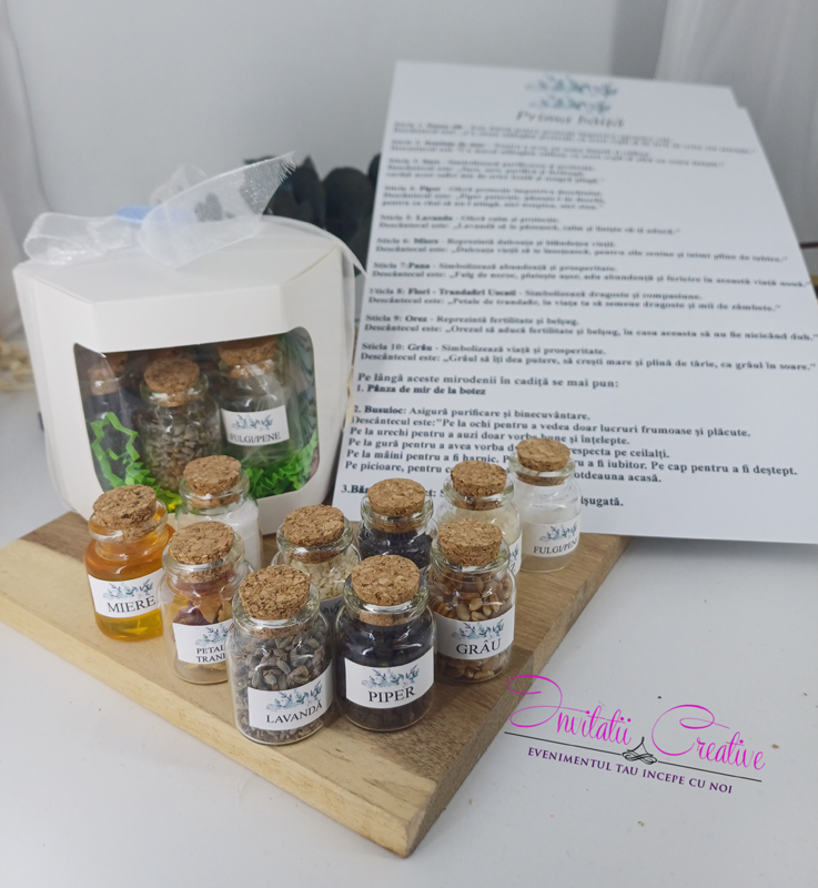 Acest set de mirodenii va transforma ceremonia băiței de mir într-un moment special și plin de iubire si va ajuta nasii cu ghidul complet al elementelor necesare. Instructiunile vă vor îndruma prin toți pașii necesari pentru a desfășura acest ritual tradițional românesc cu bucurie și ușurință.