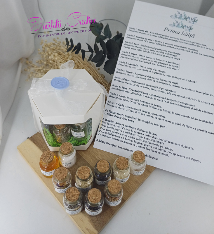 Set Prima Baita cu Nasii Mirodenii in Cutiuta cu Sigiliu este destinat utilizării în cadrul ritualului tradițional pentru baita de mir, desfășurat a doua zi după botez. Acest ritual este un moment plin de simbolism și emoție, în care copilul este curățat și binecuvântat, de nasi pentru a începe viața cu noroc, binecuvantare si sanatate.